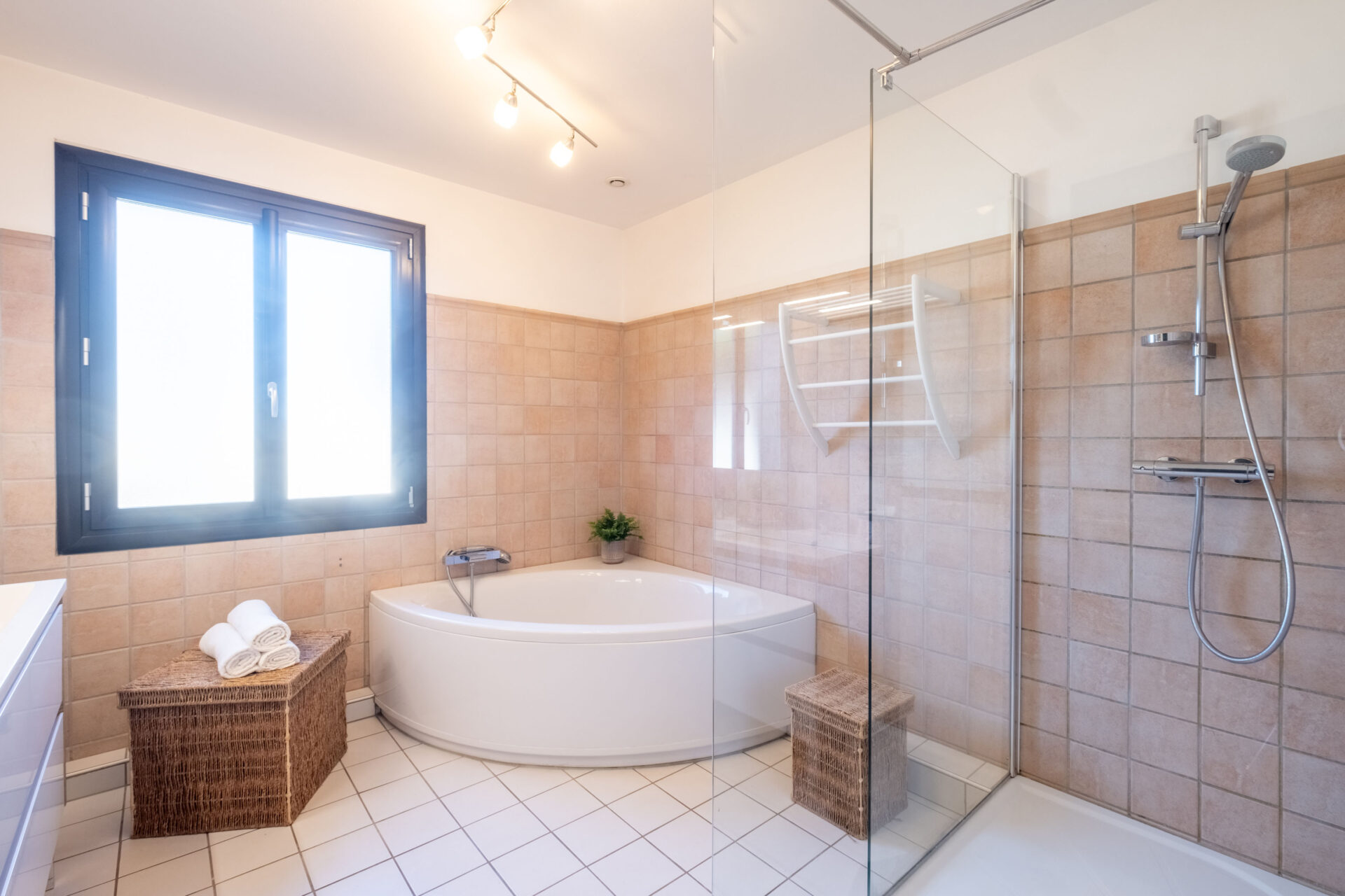 Cette chambre dispose d’une porte fenêtre et donne accès directement sur le jacuzzi.